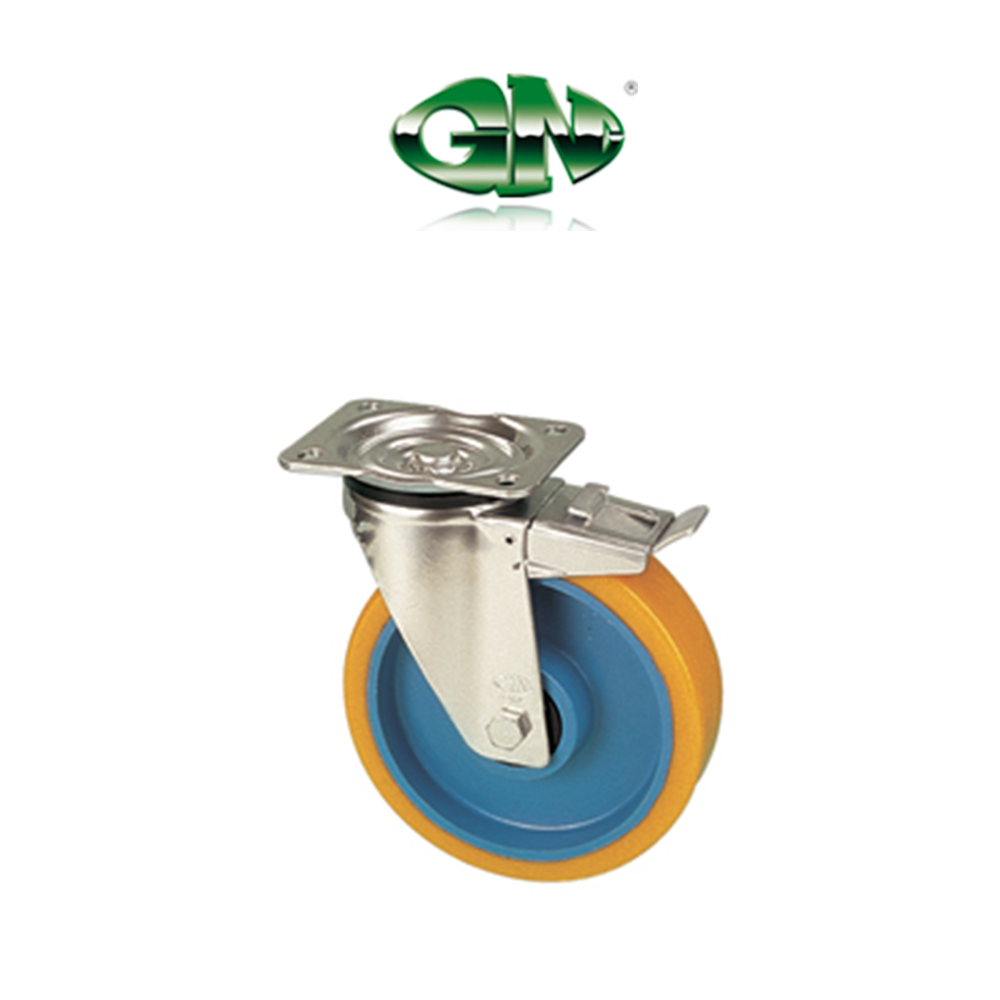 Trolley wheel diameter 80 mm with swivel plate and brake in mechanical cast iron with polyurethane coating.