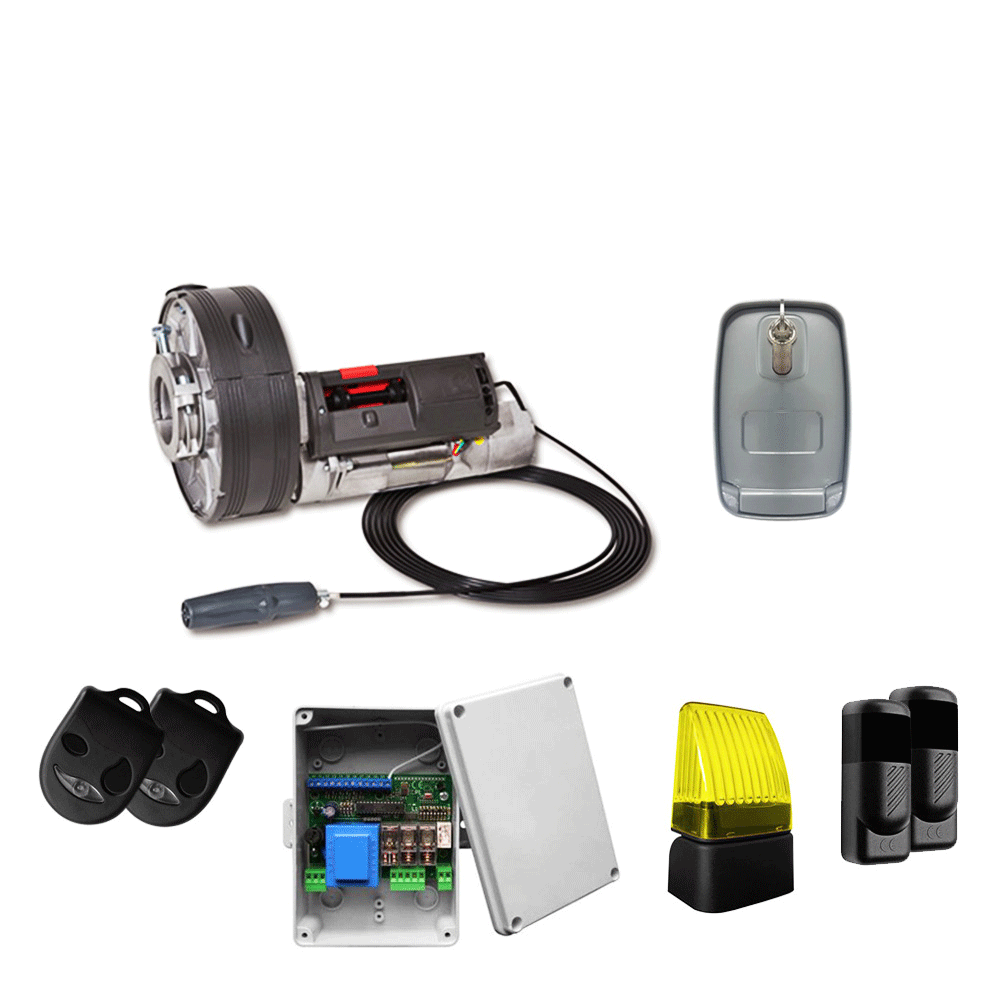 Automation kit for shutters which includes: gearmotor with electric brake 2 rolling-code radio controls control unit indicator light pair of photocells external release lock.