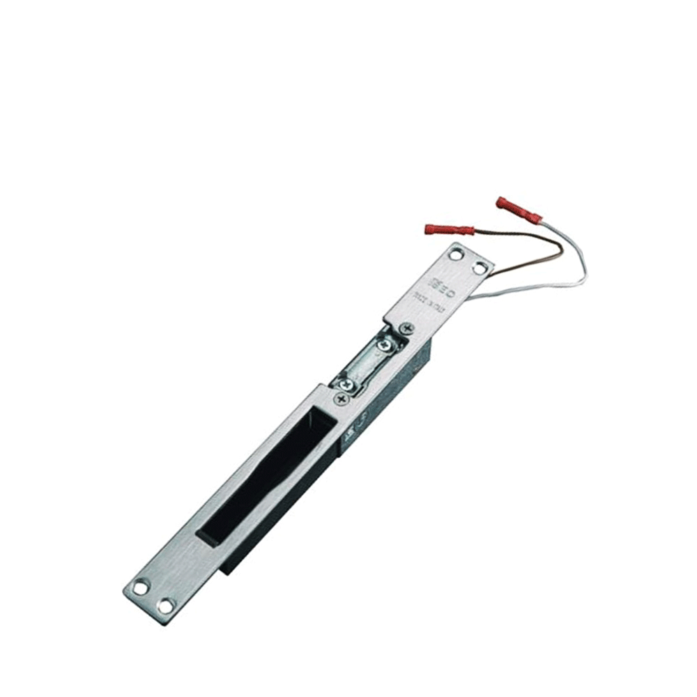 Electric strike with reversible closed counterplate, flat front 250 × 25 × 3 mm in satin stainless steel.