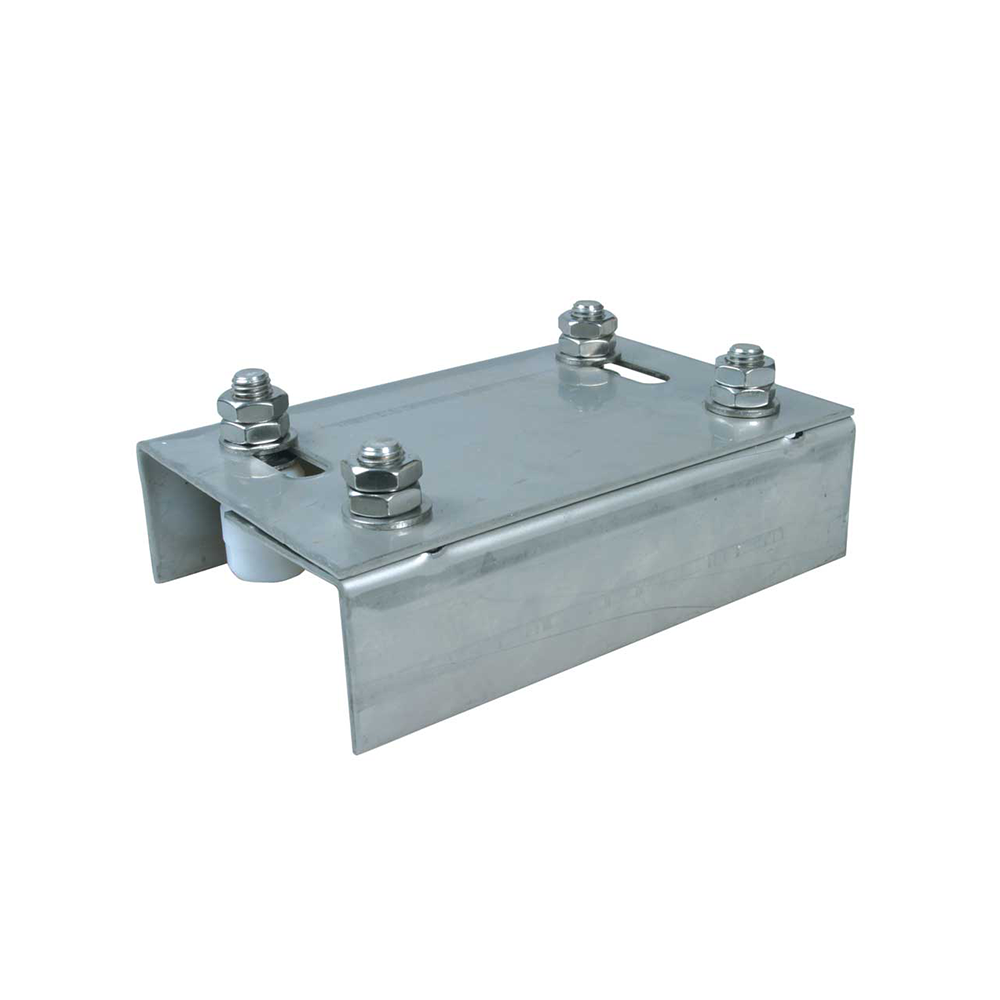 Piastra di guida regolabile a 4 rulli per cancelli scorrevoli in acciaio zincato con guide in nylon.