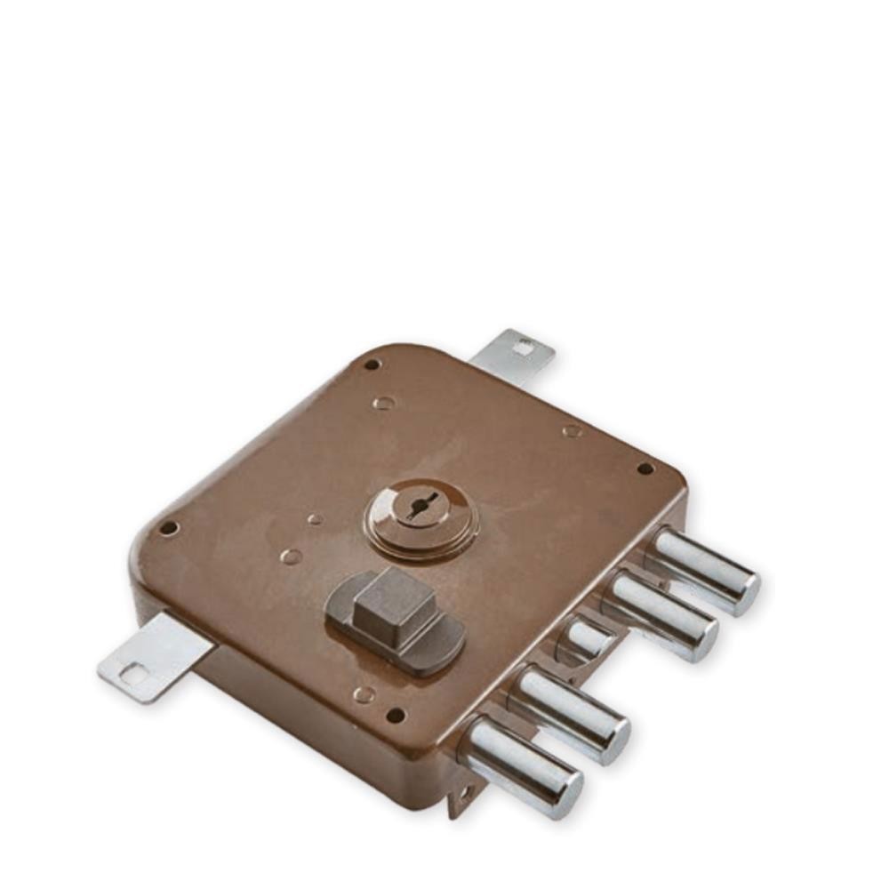 Serratura triplice per porte in Iegno e in ferro da applicare entrata 60 2 mandate con corsa 38 mm con scrocco con cilindro a pompa Press apertura interna con chiave.