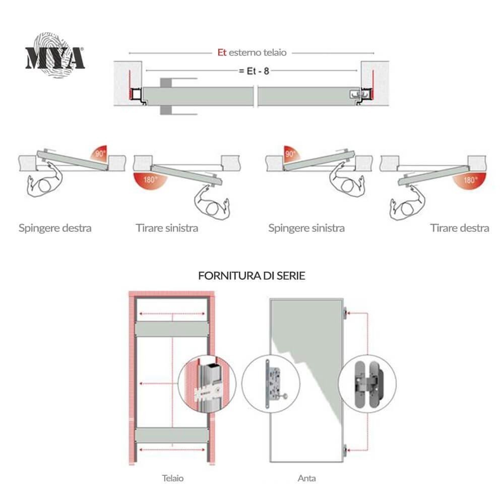 La porta filo muro MYA è una soluzione moderna e funzionale per interni, pensata per integrarsi perfettamente con pareti in muratura o cartongesso. Il telaio in alluminio estruso, unito a cerniere invisibili e serratura magnetica, garantisce un'estetica pulita e minimale. La reversibilità del battente consente l'apertura sia a destra che a sinistra senza dover specificare in fase d'ordine. Fornita grezza, è pronta per la verniciatura o personalizzazioni decorative. L'intero prodotto è progettato e realizzato in Italia, garantendo standard qualitativi elevati e durata nel tempo.