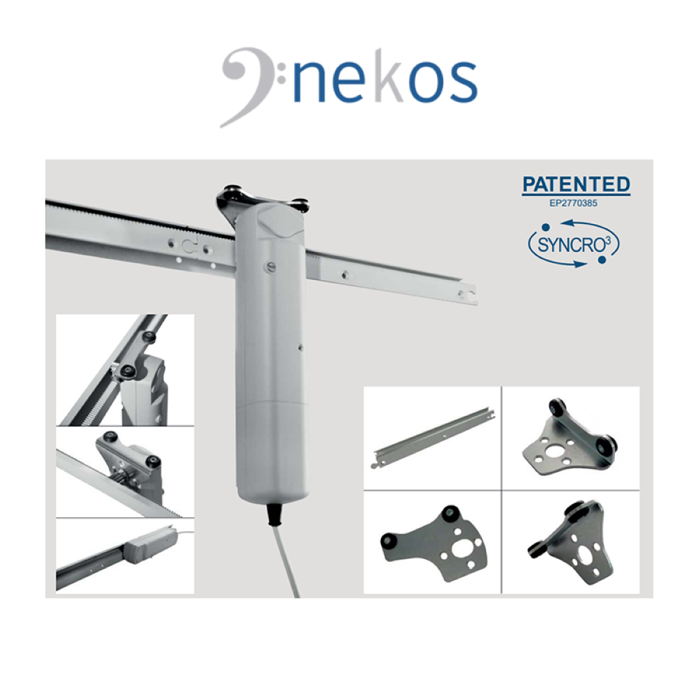 Il sistema FLIK utilizza un movimento a cremagliera e non richiede tarature complicate, con la regolazione automatica della corsa. La versione a 24V include la funzione Syncro³ (brevetto Nekos), che consente di sincronizzare 2 o più ante, anche di larghezza diversa, e interfacciarsi con serrature anti-effrazione.